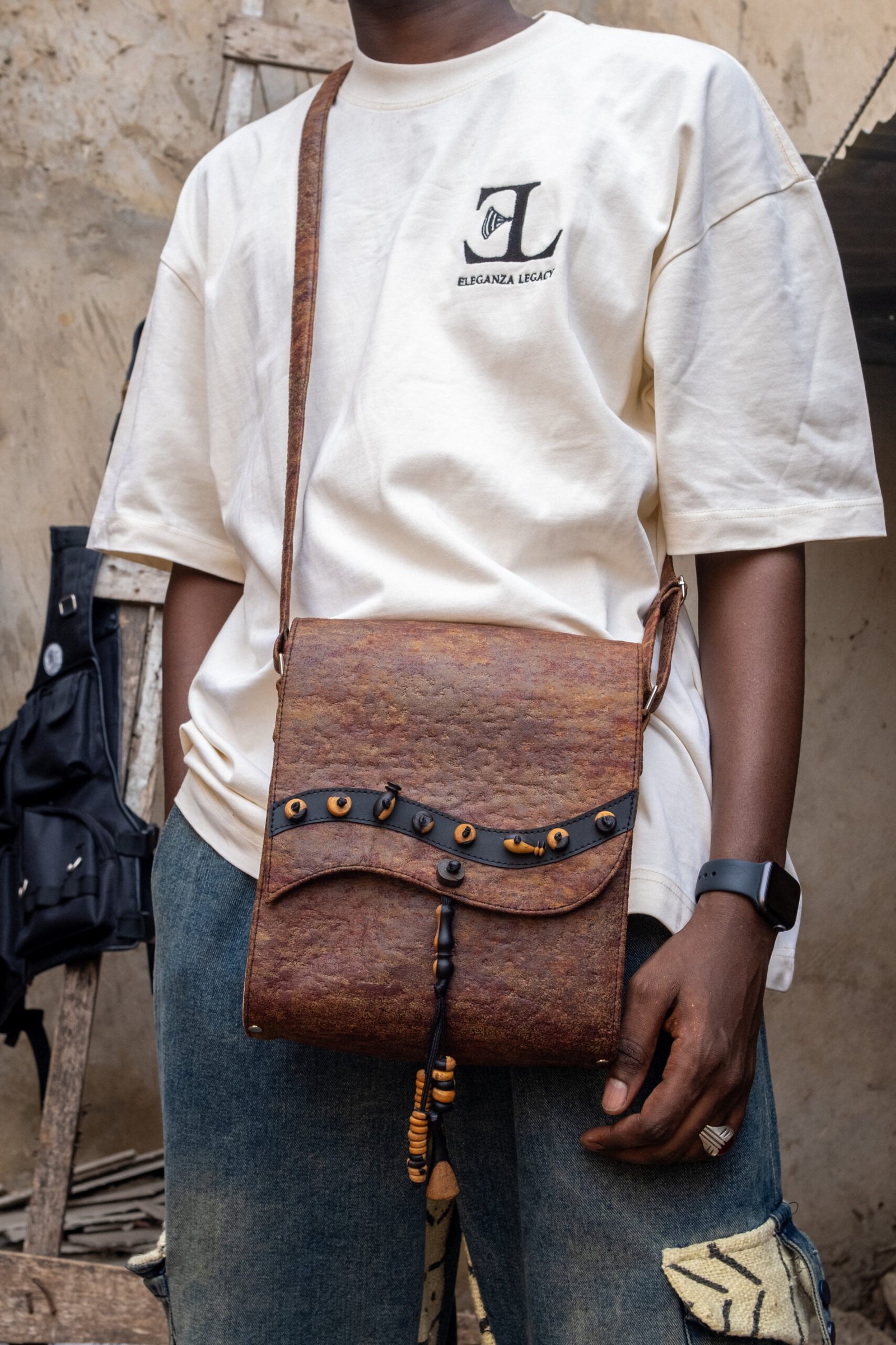 Son cuir patiné, orné de perles et de détails soigneusement travaillés, symbolise la spiritualité, la force et la transmission. Chaque couture, chaque texture raconte un héritage : celui de la résilience et de la beauté artisanale africaine.